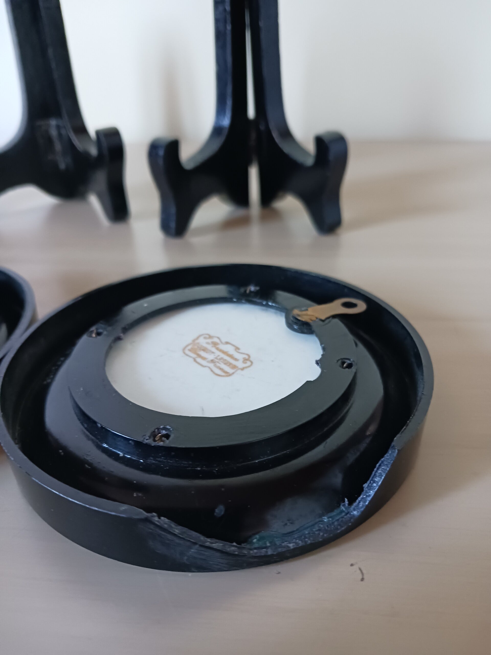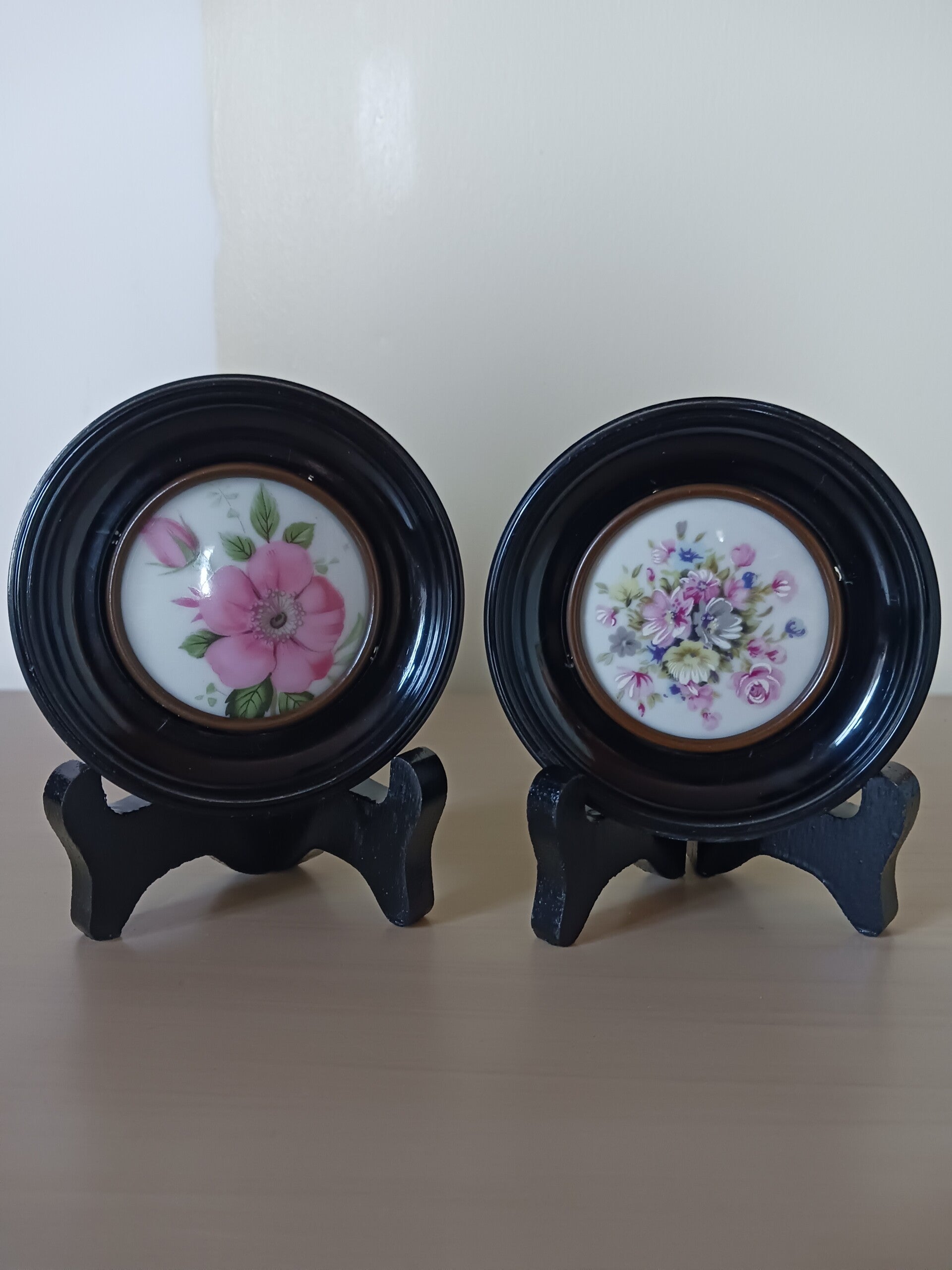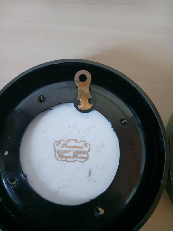 2 jolis petits cadres médaillons , en porcelaine de Limoges , Goumot et Labesse . Décor floral, peint à la main, très raffiné . Les 2 porcelaines sont estampillées et en très bel état .Le cadre de l'un est juste cassé à un endroit . La cassure n'est pas visible quand le cadre est posé sur le chevalet ou accroché au mur .(attache au dos ) Dimensions : 9 c de diamètre avec l'encadrement . Poids : 132 grammes environ pour les 2 . Les 2 chevalets sont offerts .